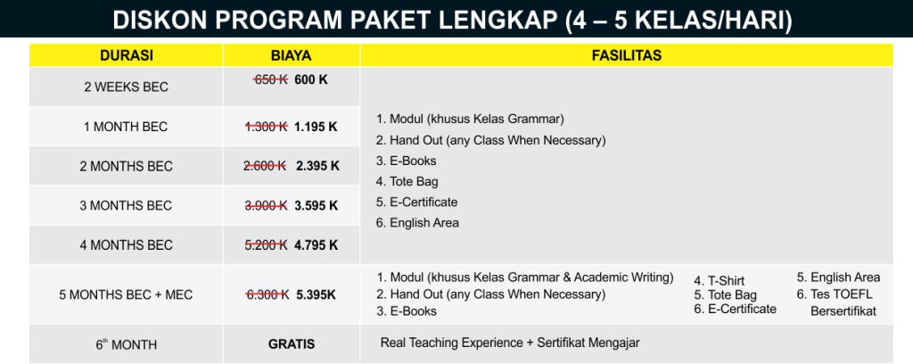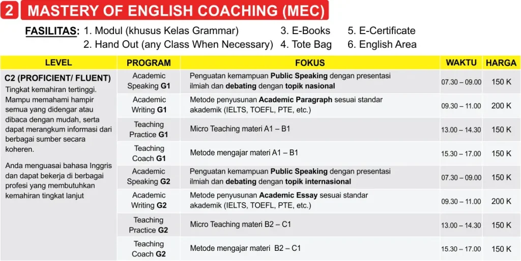 Kelas persiapan TOEFL terstruktur dengan latihan dan final scoring.